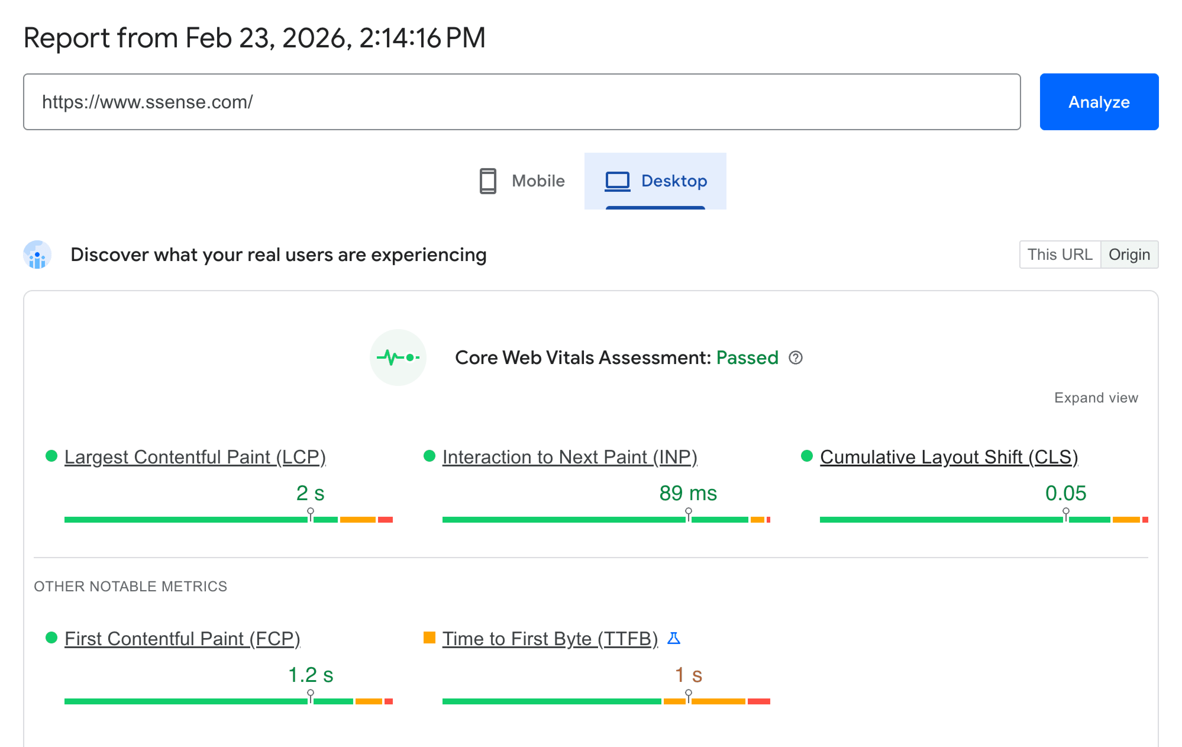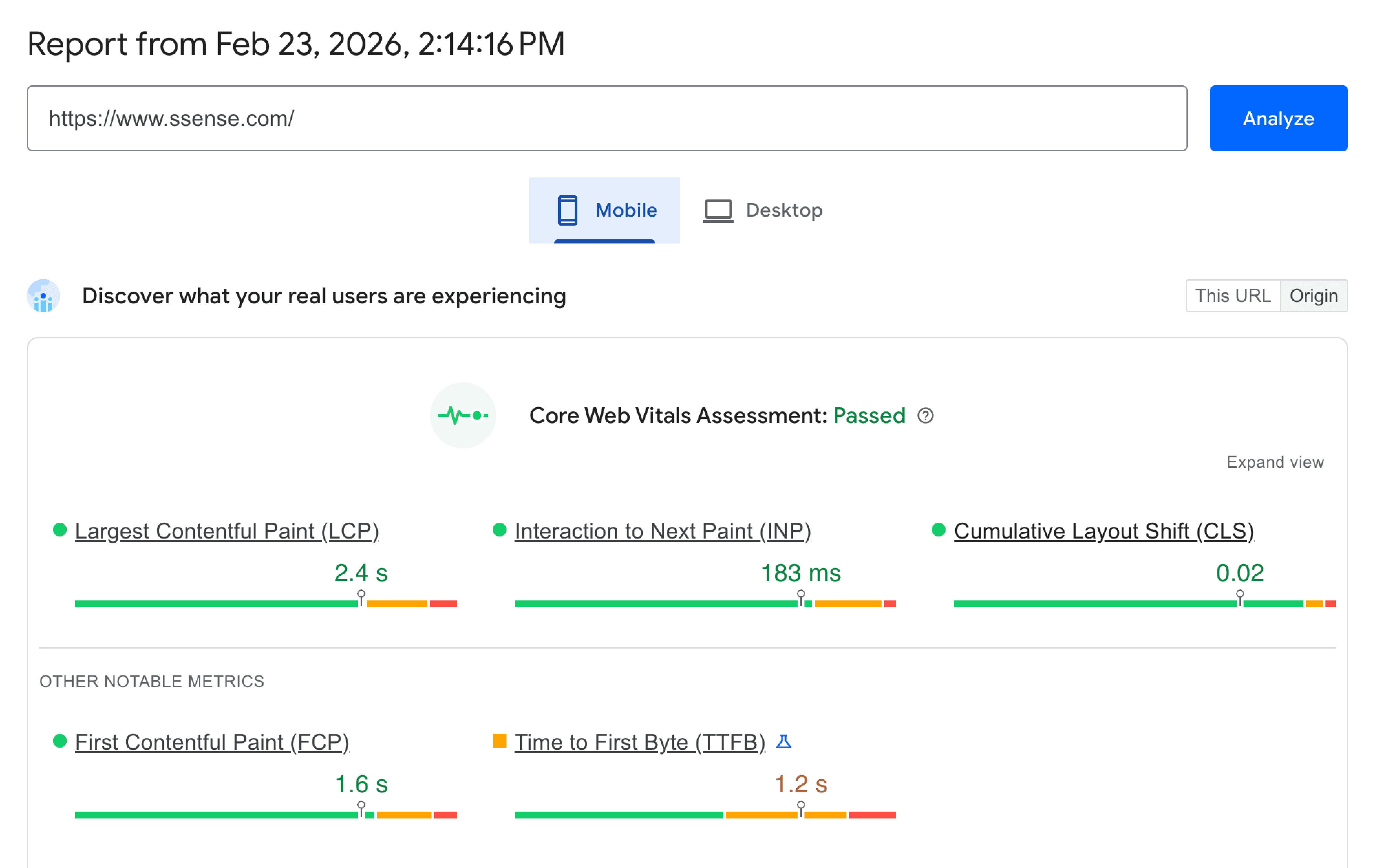 Result: ShopMy is ~1.7× as slow (LCP) and ~2.4× as unstable (CLS) as Ssense, despite comparable image density.