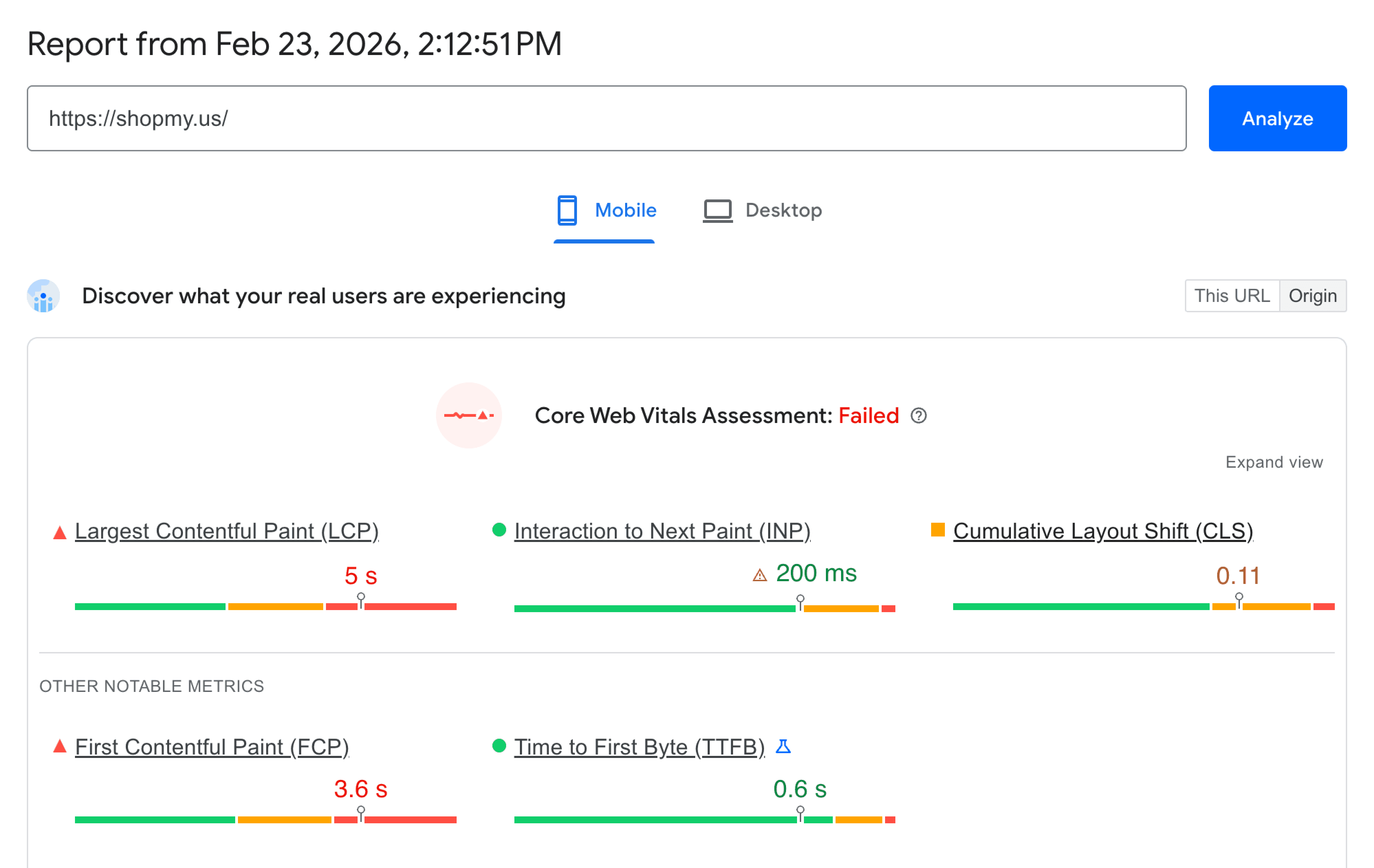 Chrome UX Report shows ShopMy underperforming benchmarks.