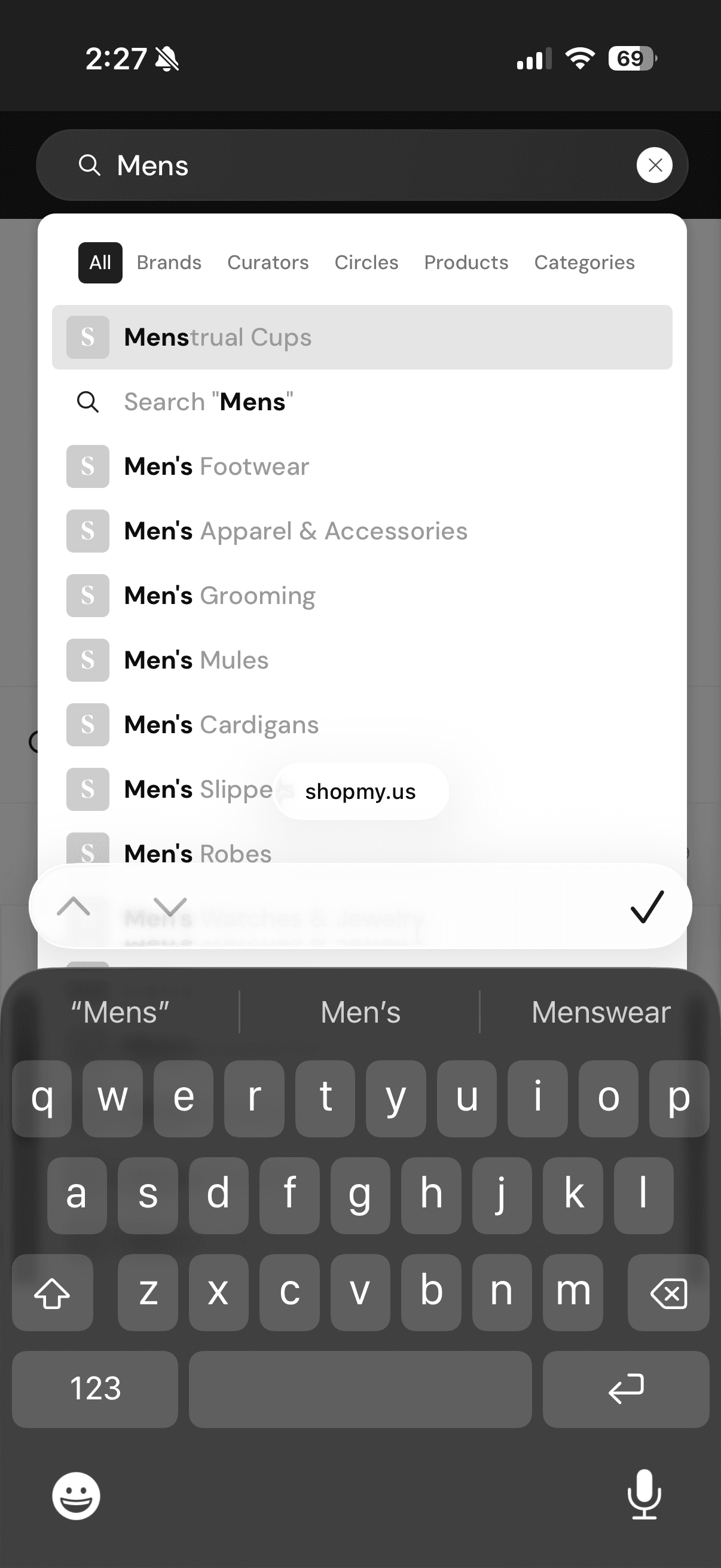 ShopMy’s biggest blind spot isn’t luxury, it’s menswear. A telling signal: the top result when searching “Mens” is “Menstrual Cups.”